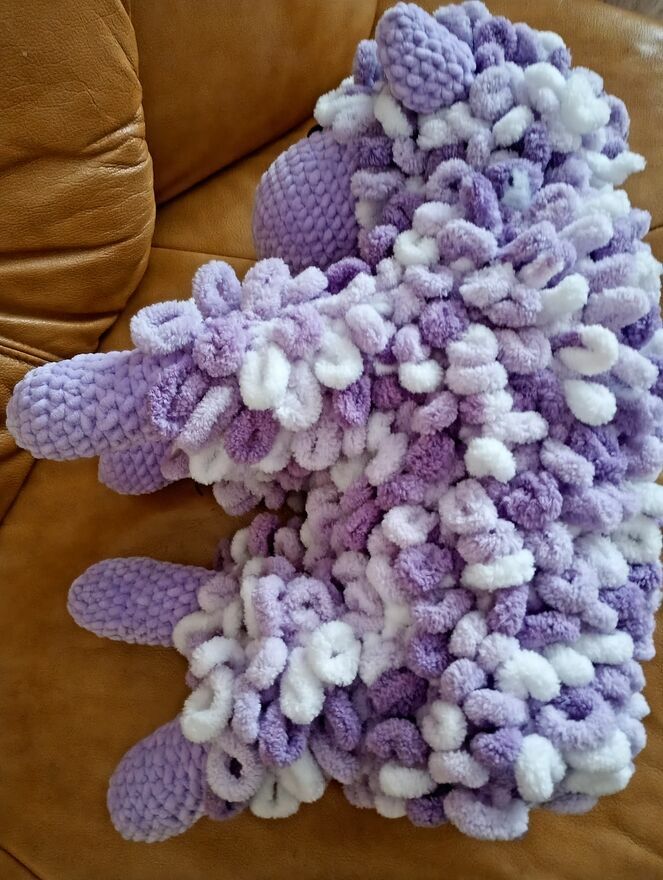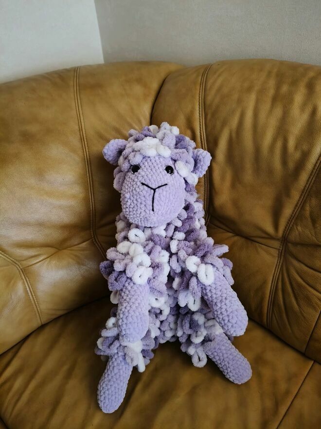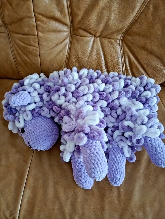 Mam do sprzedania własnoręcznie wykonaną owieczkę z włóczki Alize puffy w kolorze fioletu. Maskotka jest nowa nie używana. wypełniona włókniną poliestrową. Długość 48 cm. Idealny prezent do przytulanki.Beata
