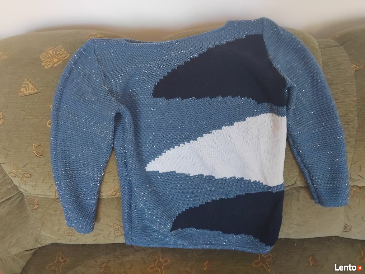 Sweter w dobrym stanie w kolorze biało niebieskim ze srebną nitką. PolecamMonika